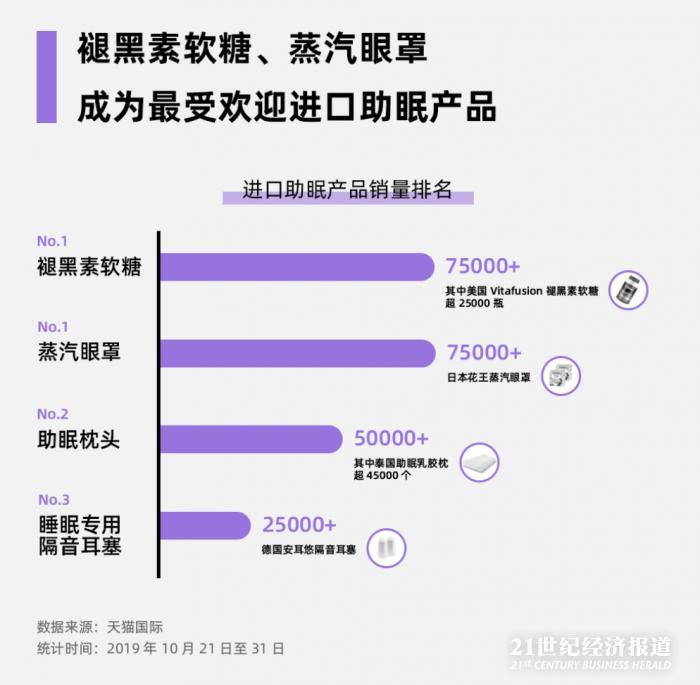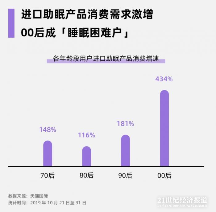 天猫双11预售期间,在天猫国际购买进口助眠类商品的人数同比增长174%,其中,00后增长达434%。