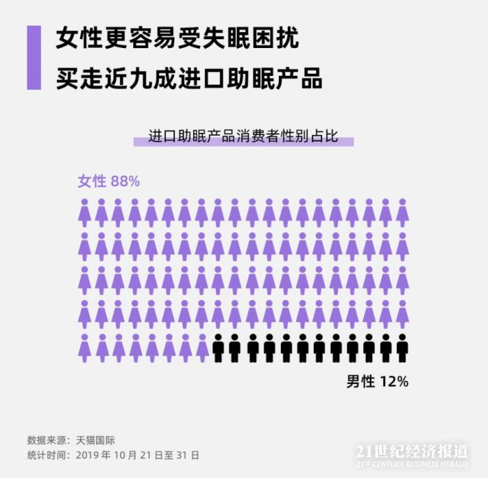 此外,女人比男人更受睡眠困扰,天猫国际上购买助眠产品的女性用户占比88%。
