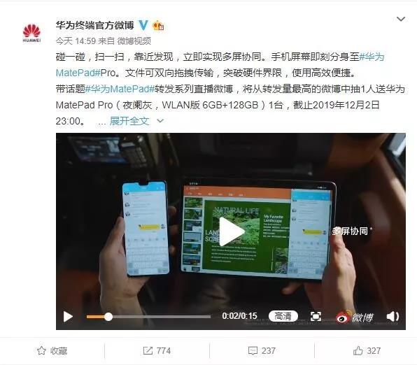 据称,通过碰一碰、扫一扫、靠近发现等操作,可立即实现多屏协同,手机屏幕即刻分身至华为MatePad Pro。