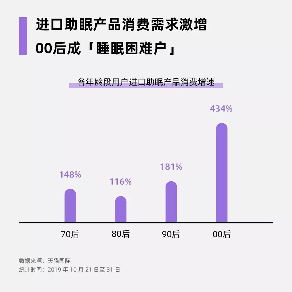 天猫双11预售期间,在天猫国际购买进口助眠类商品的人数同比增长174%,其中,00后增长达434%。