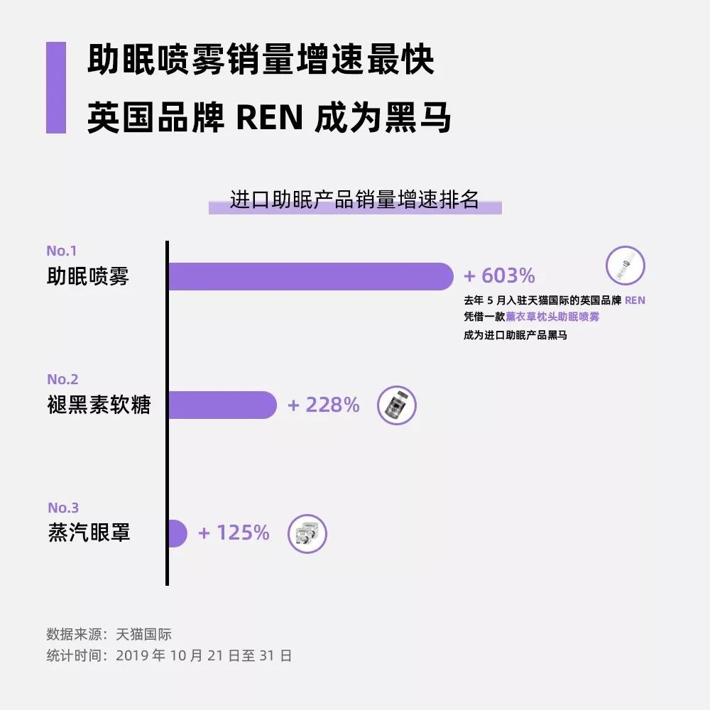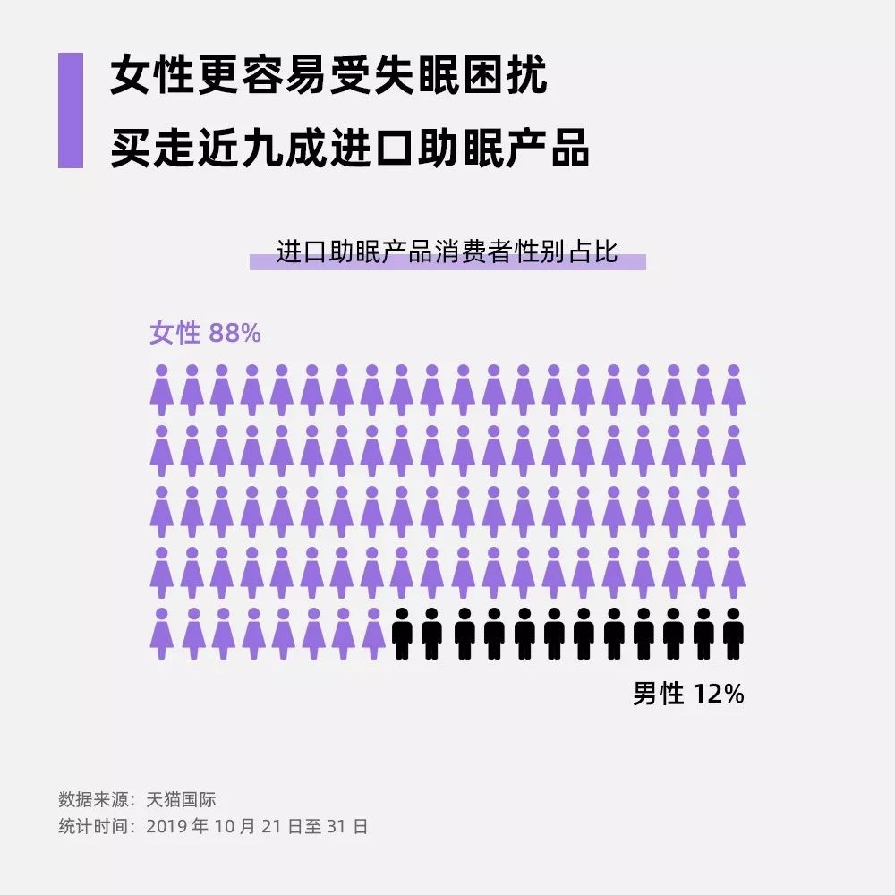 此外,女人比男人更受睡眠困扰,天猫国际上购买助眠产品的女性用户占比88%。