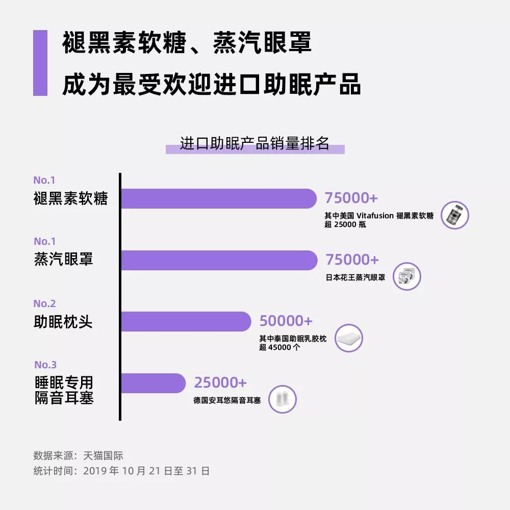 褪黑素软糖、蒸汽眼罩、助眠乳胶枕、睡觉专用耳塞、助眠喷雾等趋势新品最受欢迎。10月21日至31日预售期间,天猫国际上的褪黑素软糖卖出超75000瓶,其中Vitafusion褪黑素软糖超25000瓶,花王蒸汽眼罩卖出超75000盒,助眠泰国乳胶枕45000个,德国安尔悠睡觉专用耳塞卖出25000对。