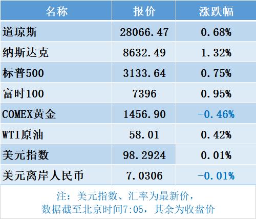 1、美国三大股指收涨,纳指、标普500指数均创历史新高。道指涨0.68%报28066点,纳指涨1.32%报8632点,标普500指数涨0.75%报3134点。LVMH宣布以每股135美元收购蒂芙尼,蒂芙尼收涨逾6%。
