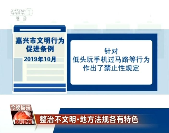 10月份,《嘉兴市文明行为促进条例》获浙江省人大常委会批准。这一条例针对低头玩手机过马路等行为作出了禁止性规定,“行人通过路口或者横穿道路时浏览手持电子设备或者嬉闹的,处警告或者五元以上五十元以下罚款”。早在今年1月1日,浙江温州就通过立法成为全国首个对低头玩手机过马路作出法规约束的城市。