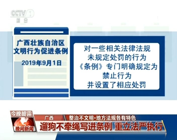 今年9月1日,《广西壮族自治区文明行为促进条例》正式施行。对一些相关法律法规未规定处罚的行为,条例专门明确规定为禁止行为,并设置了相应处罚。比如乱涂、乱画、乱刻,随意张贴、喷涂广告,未及时清理犬只在户外产生的排泄物,乘坐公共交通工具强占他人座位,干扰公共交通工具正常行驶等等。遛狗不牵绳这种令人厌恶的行为被戴上“紧箍咒”,这让很多人拍手叫好。