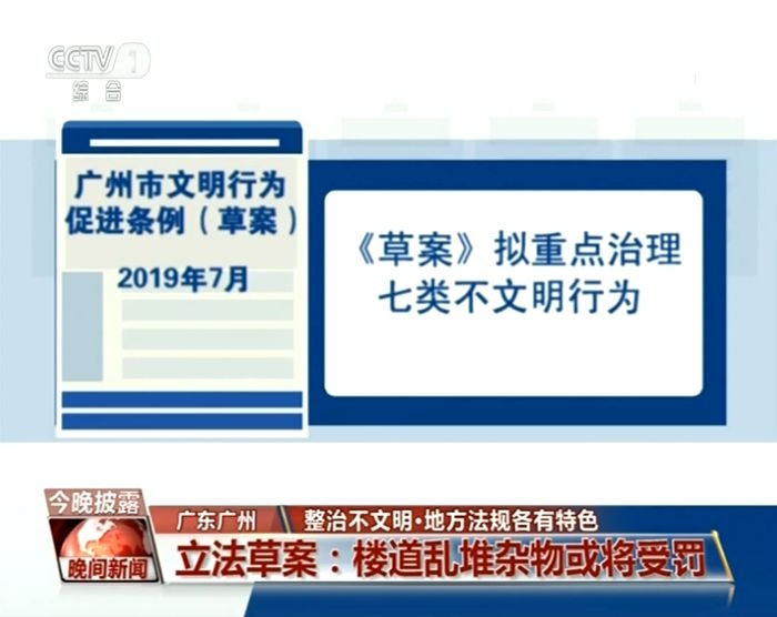 今年7月,广州市也举办了《广州市文明行为促进条例(草案)》立法听证会,草案拟重点治理七类不文明行为,除了乱扔垃圾、随地吐痰、遛狗不牵绳、霸座等,《草案》还拟规定在住宅小区楼道、绿地等公共区域乱堆杂物,由街道办事处处以二百元以上二千元以下罚款,并责令清除;拒不清除的,强制清除,费用由违法责任人承担。