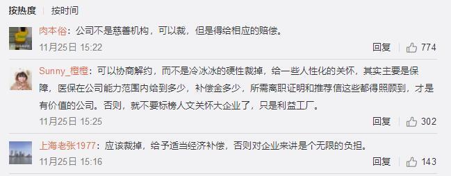 有意思的是,评论区中点在数最高的几条评论,均是“中立派”观点,认为企业不是慈善机构,要照顾所有患重病的员工未免压力太大,但要裁员的话,也一定要保证保障给到位: