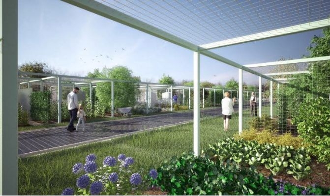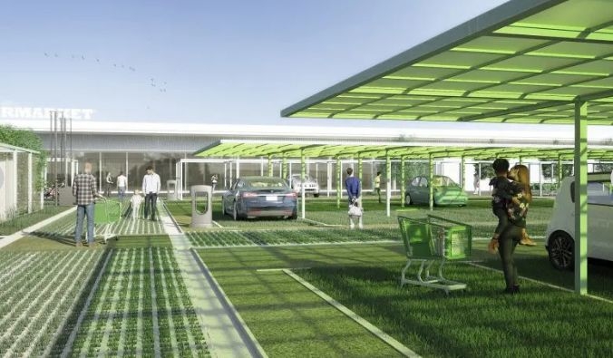大型商场的停车场通常占地好几英亩,但大部分时间里都是空置的。法国设计公司Studio NAB推出“停车场2.0(Car Parks 2.0)”,将停车场改造成一座城市农场,同时在旁边留出一小块空间,通过现场安装的太阳能电池板为电动汽车充电。