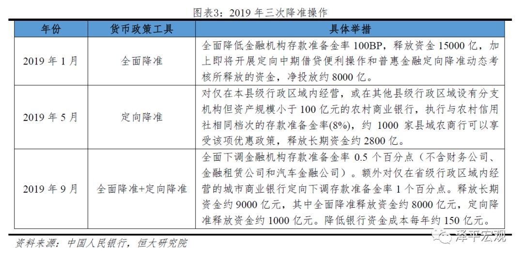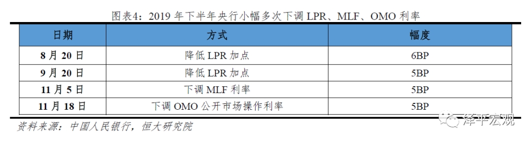 2019年前三个季度货币政策稳健,国内经济下行压力大,外部全球降息潮和中美贸易摩擦再起波澜,金融供给侧结构性去杠杆和金融严监管的背景下,央行结构性宽松、疏通货币传导渠道。2019年央行3次降准,多次下调LRP利率、MLF利率和OMO利率。其中1月和9月两次全面降准,货币政策边际放松,坚持不走“大水漫灌”的老路,主动作为、精准发力,扭转局部性社会信用收缩局面,缓解民营和小微企业融资难融资贵问题,稳妥化解中小银行局部性结构性流动性风险。2019年前三季度央行货币政策执行报告口径均为“稳健”。