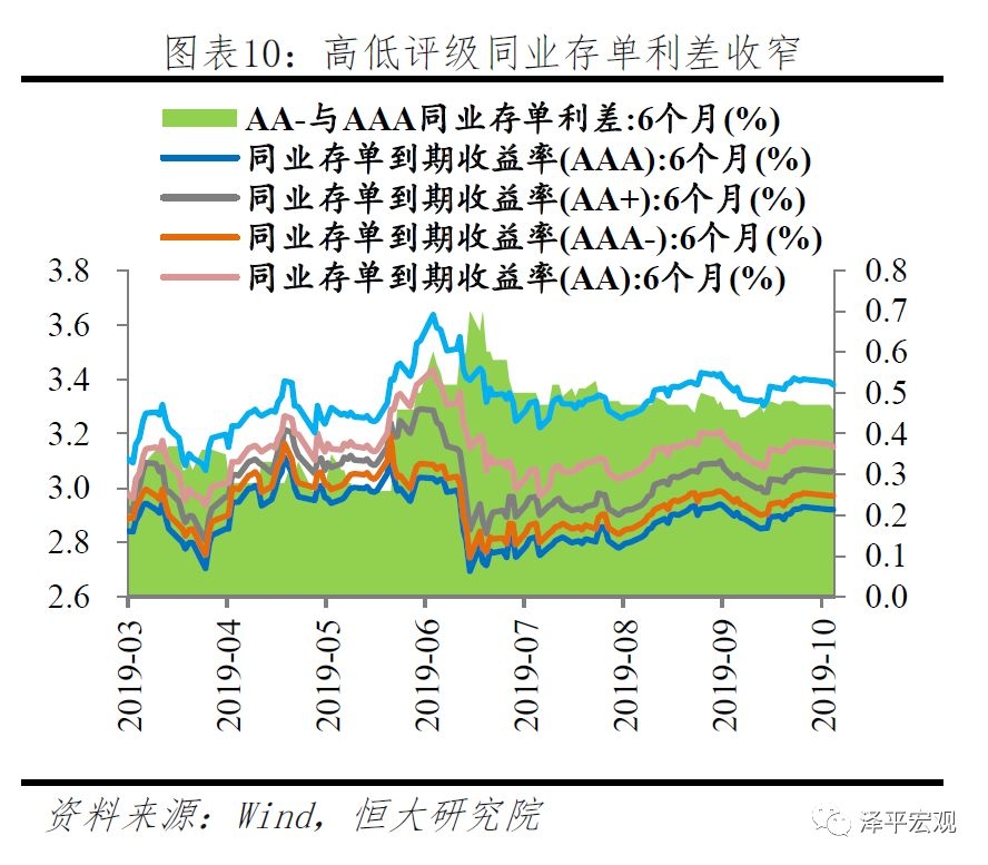 民企与地方国企的信用利差均处于历史高位,近年来呈现扩大趋势。2017年下半年至2018年末,社会融资规模同比增速持续下滑,与此同时流动性分层加剧,民营企业与地方国企产业债的信用利差持续上升,民企融资贵问题突出。2019年初,供给侧结构性改革发力,向中小银行定向降准,投放流动性,民企融资贵现象有所缓解。但2019年5月包商银行事件打破同业刚兑后,民企与国企信用利差回升,融资成本有提高趋势。10月末地方政府专项债券余额同比增长29.5%,委托贷款、信托贷款却同比下降8.2%和4.1%,表明地方政府以及国企融资环境改善,而民营、中小企业融资可得性仍然较差。
