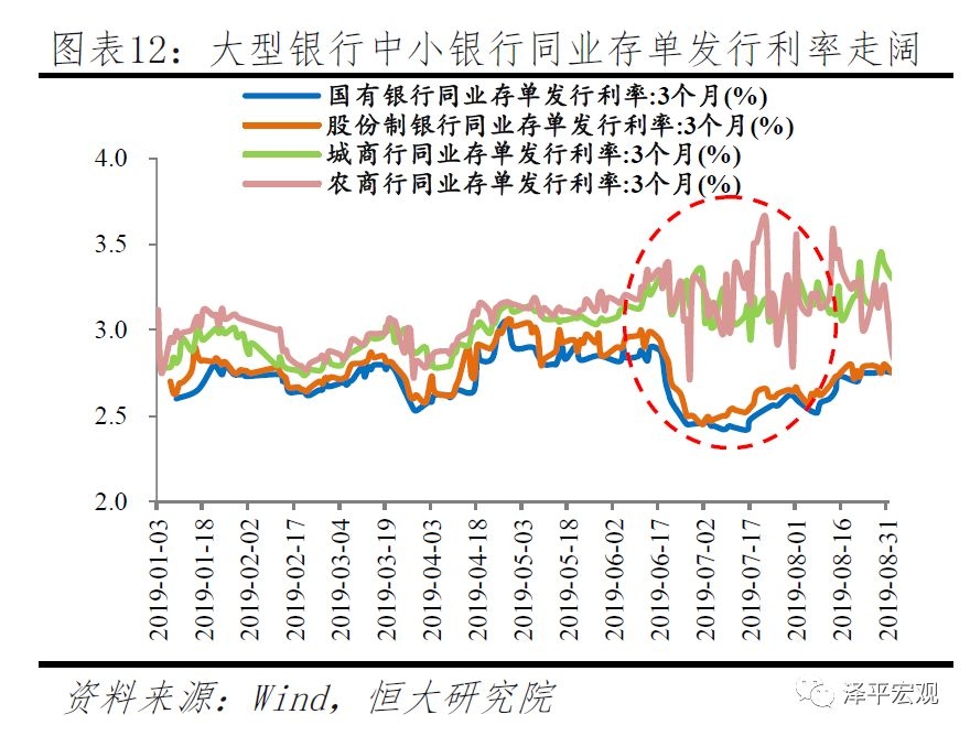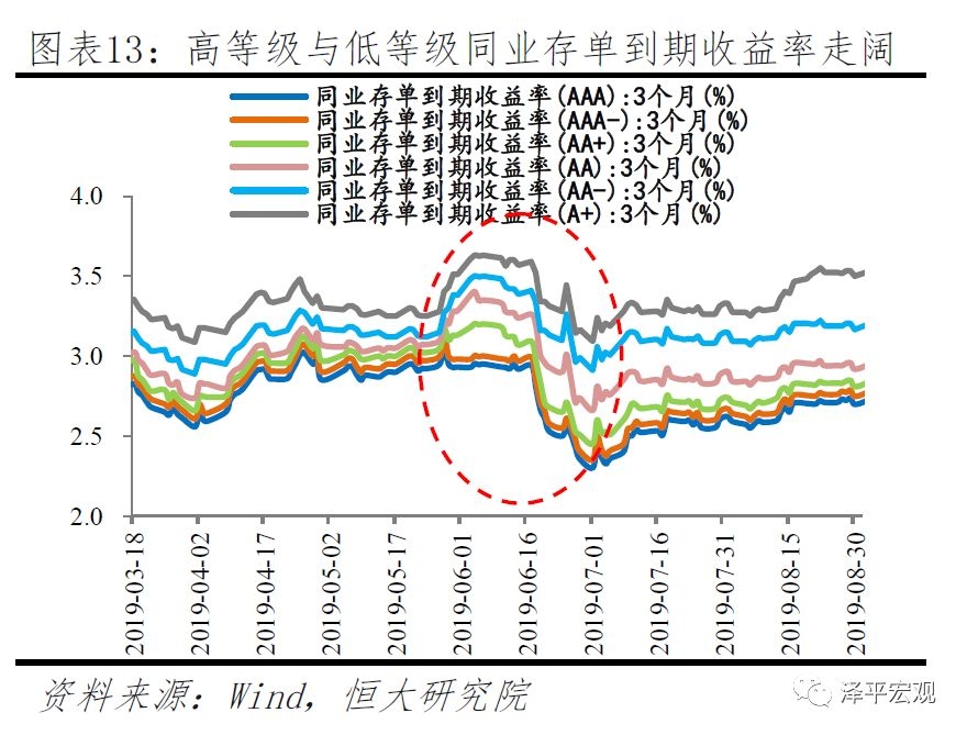 2.3 结构:局部紧张,流动性分层2019年5月包商银行被接管事件加剧流动性分层。一方面,银行业金融机构刚兑被打破,市场风险偏好整体降低,导致实体信用溢价不断上升,贷款利率升高,造成民企和中小企业融资难融资贵困境;另一方面,金融体系流动性分层背景下,资金大多流向银行,但银行风险偏好低,资金很难流向民企和中小企业,需要非银金融机构提供支持。因此,2019年货币环境在流动性分层影响下,出现银行间市场利率普遍较低、但实体经济融资市场利率走高的分层现象,货币环境整体稳健、局部紧张。第一,国企和民企的信用利差扩大,流动性分层加剧。