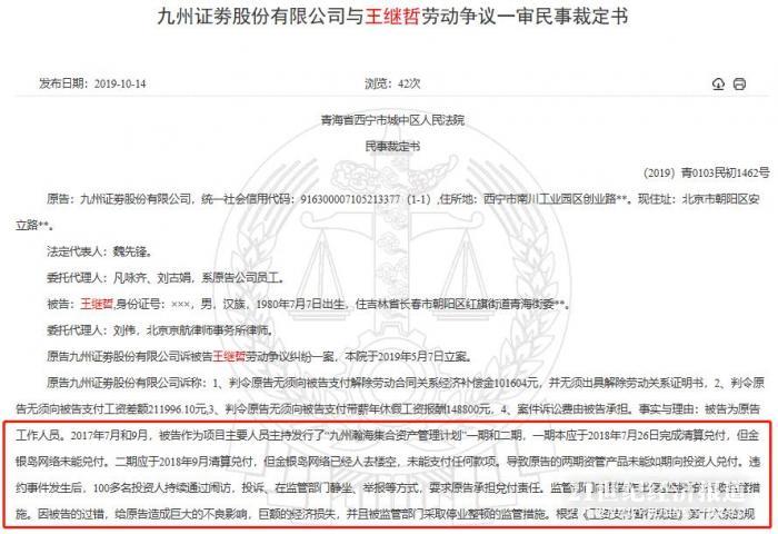 根据(2019)青0103民初1462号《九州证劵股份有限公司与王继哲劳动争议一审民事裁定书》,原告九州证劵称,2017年7月和9月,王继哲作为项目主要人员主持发行了“九州瀚海集合资产管理计划”一期和二期,一期本应于2018年7月26日完成清算兑付,但金银岛网络未能兑付。二期应于2018年9月清算兑付,但金银岛网络已经人去楼空,未能支付任何款项。导致九州证券的两期资管产品未能如期向投资人兑付。违约事件发生后,100多名投资人持续通过闹访,投诉、在监管部门静坐、举报等方式,耍求原告承担兑付责任。监管部门向原告作出停业整顿的行政监管措施。