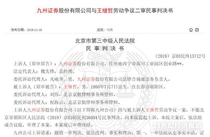 北京市第三中级人民法院10月在二审民事判决书中再次驳回了九州证券的诉讼请求。这也是终审判决。
