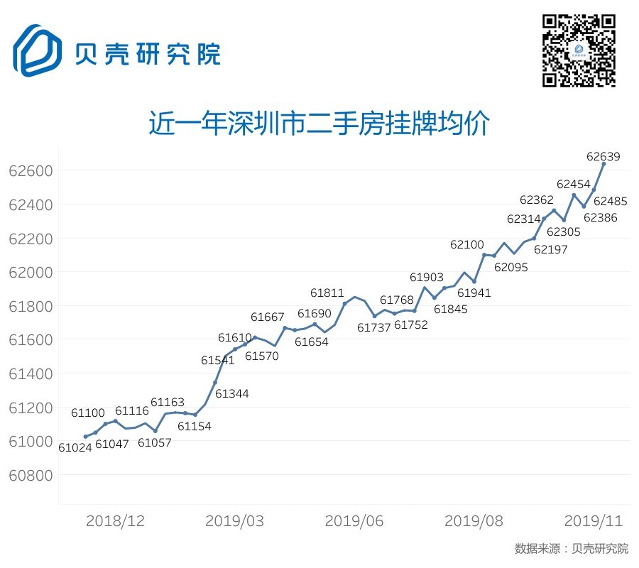 深圳成为二手房挂牌均价唯一上涨的四大一线城市,从61024元上涨至最新的62639元,涨幅近3%。