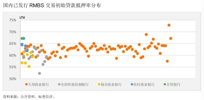 存续的个人住房贷款资产支持证券(RMBS)交易也从侧面印证了中国贷款抵押率相较其它成熟市场来说处于较低水平的结论。截至2019 年9月末,国内银行间市场已发行RMBS交易148 单,初始加权抵押率主要分布在55%至65%之间。