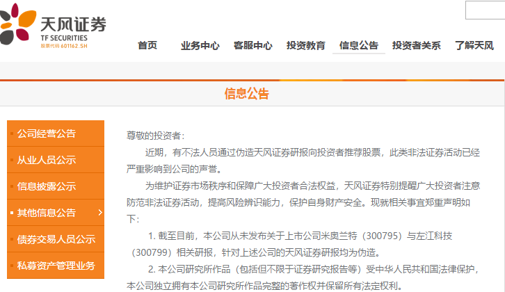 11月27日,天风证券发布的声明指出,近期,有不法人员通过伪造天风证券研报向投资者推荐股票,此类非法证券活动已经严重影响到公司的声誉。截至目前,本公司从未发布关于上市公司米奥兰特与左江科技相关研报,针对上述公司的天风证券研报均为伪造。
