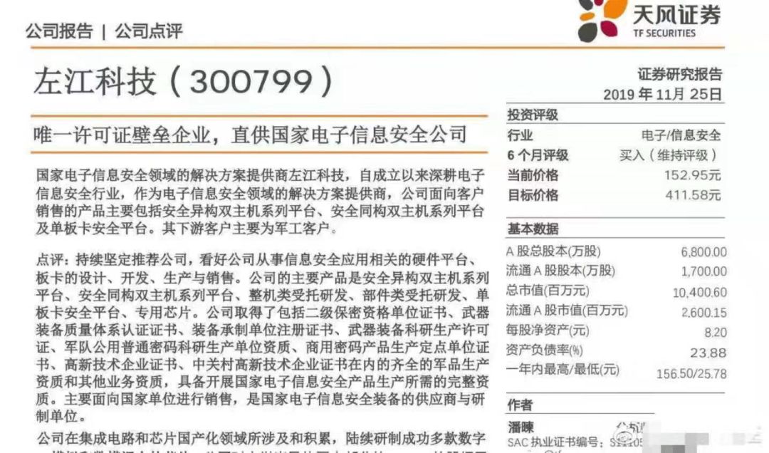 与此相仿,显示11月25日刊发的左江科技研报,同样采用了天风证券的研报格式,标题是《唯一许可证壁垒企业,直供国家电子信息安全公司》,段落间排版也不严谨。