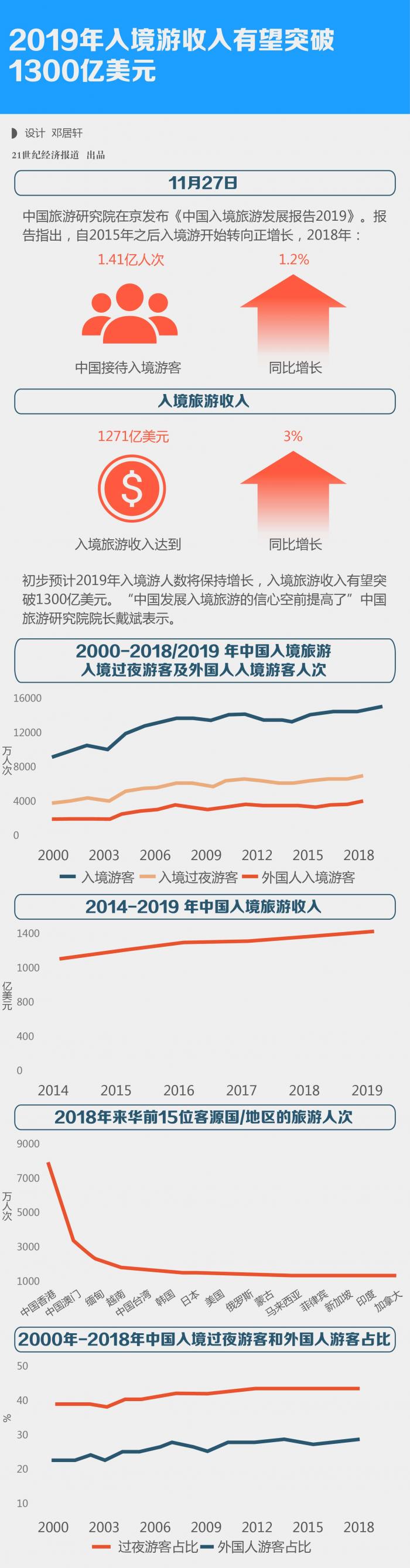 11月27日,中国旅游研究院在京发布《中国入境旅游发展报告2019》。报告指出,自2015年之后入境游开始转向正增长,2018年,中国接待入境游客1.41亿人次,同比增长1.2%,入境旅游收入达到1271亿美元,同比增长3%。初步预计2019年入境游人数将保持增长,入境旅游收入有望突破1300亿美元。“中国发展入境旅游的信心空前提高了”中国旅游研究院院长戴斌表示。