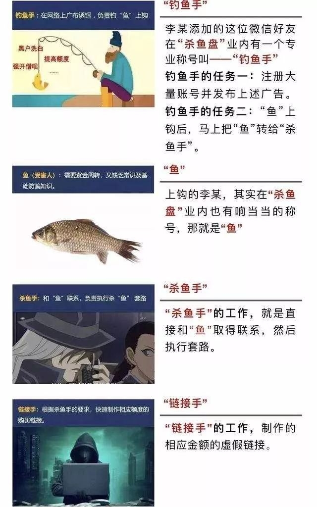朱警官介绍,“杀鱼盘”中主要涉及三个角色,“鱼”、“钓鱼手”和“杀鱼手”。“钓鱼手”主要负责引“鱼”上钩,在社交、游戏等网络平台发布虚假广告,骗得“鱼”也就是受害者的信任,然后把“鱼”交给“杀鱼手”,“杀鱼手”来具体实施套路。