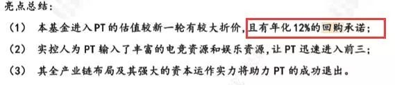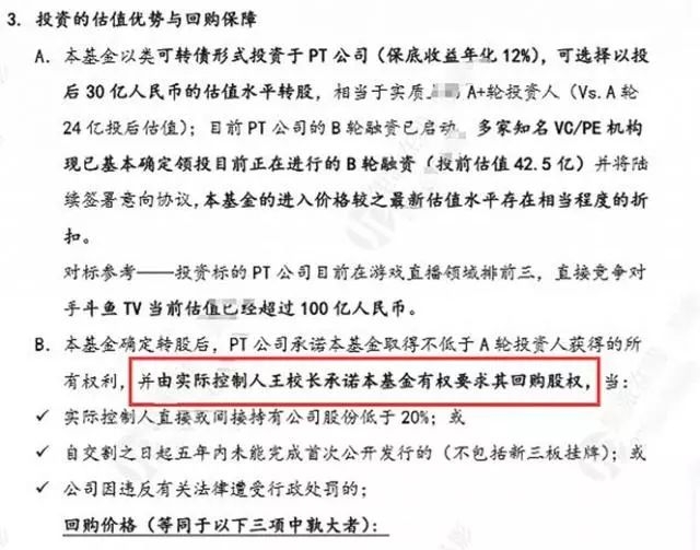 “本基金确定转股后,PT公司承诺本基金取得不低于A轮投资人获得的所有权利,并由实际控制人王校长承诺本基金有权要求其回购股权”和“年化12%的回购承诺”。