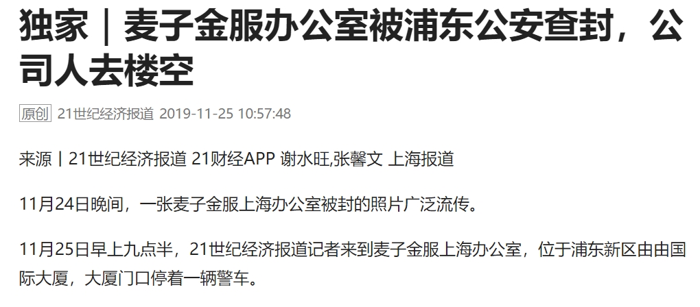 据21世纪经济报道,11月25日,沪老牌网贷平台麦子金服办公室被浦东公安查封,公司人去楼空。