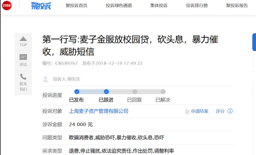 在来自21CN的聚投诉平台上,也有来自对麦子金服放校园贷的控诉:砍头息、暴力催收、威胁短信。