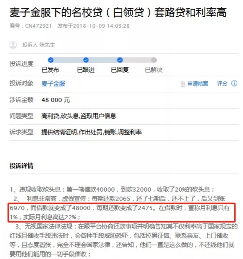 于是乎,在2017年麦子金服也宣布,停止“名校贷”业务,开始往“白领贷”等新业务发展,但其后白领贷又被诉涉嫌套路贷,变相收取高额砍头息、暴力催收等,最终也搞不下去了。