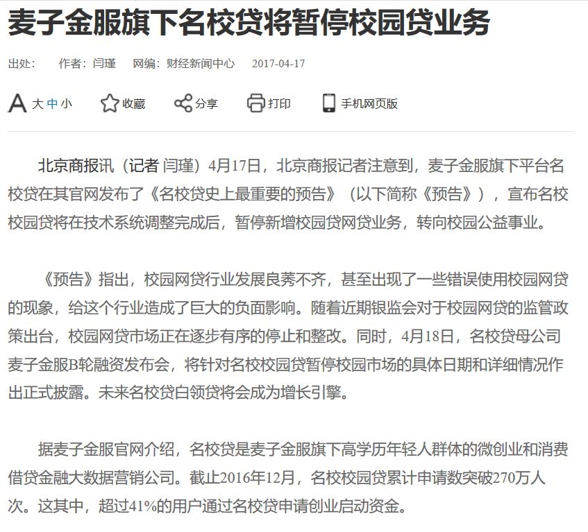 图为北京商报报道:麦子金服暂停校园贷业务,数据显示,校园贷服务人数已经超过270万人。