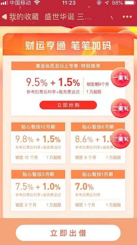 以其贴心智投12月期产品为例,参考扣费后利率为9.8%,还能在加上1.5%服务费返还,相当于11.3%的回报率。