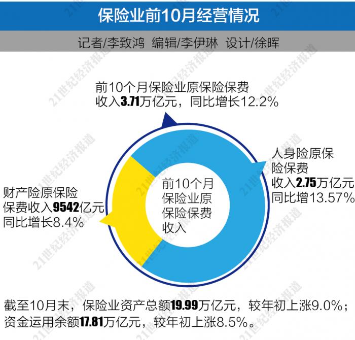 具体为,前10个月保险业原保险保费收入3.71万亿元,同比增长12.2%。其中,财产险原保险保费收入9542亿元,同比增长8.4%;人身险原保险保费收入2.75万亿元,同比增13.57%。