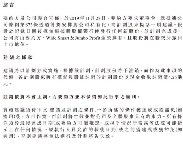 公告称,公司将向联交所申请根据上市规则第6.15条自生效日期起撤销股份于联交所的上市地位。倘计划并未生效或建议在其他情况下失效,则将不会撤销股份于联交所的上市地位。此外,公司已向联交所申请自2019年11月28日上午九时正起恢复股份于联交所买卖。