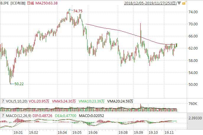 自2019年1月1日以来,国际原油价格震荡运行,截至撰稿时,布油主力合约交投于62.7美元/桶附近,年度上涨16.45%;年平均线位于63.35美元/桶附近,大致处于大多数预测的中间水平,略低于EIA的最新预期。