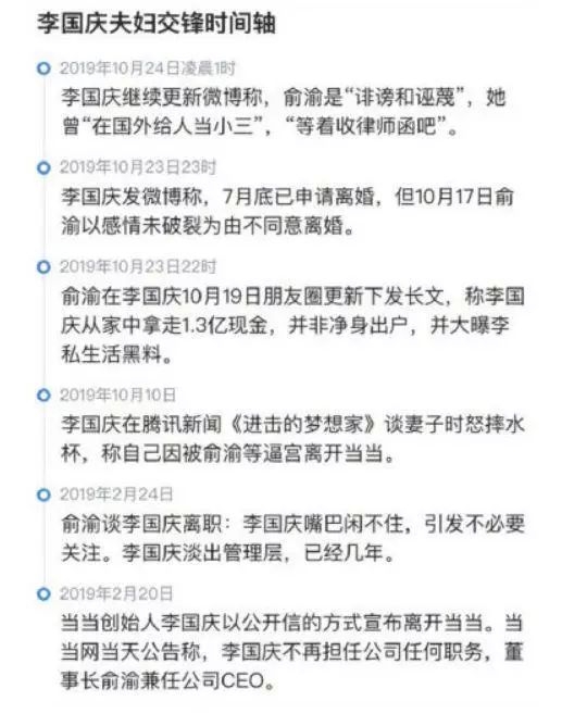 李国庆在回应中表示,俞渝从当当的帮忙者,到小股东,再到现在的境外绝对持股大股东,不仅将其从为之奋斗了半生的事业中扫地出门,还诽谤企图让其名誉扫地。李国庆称,自己和俞渝的婚姻已经走到尽头,相信法院会做出公正判决。