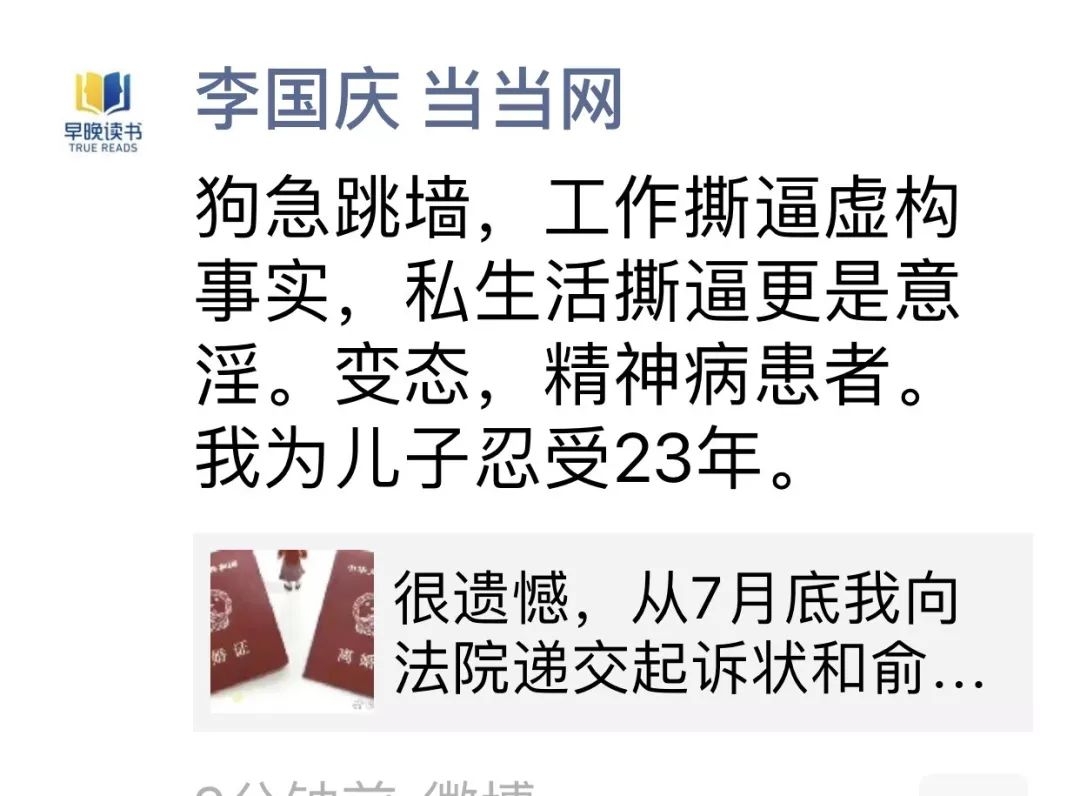 李国庆则转发自己7月底递交起诉状和俞渝离婚的微博,并表示,“狗急跳墙,工作撕逼虚构事实,私生活撕逼更是意淫。变态,精神病患者。我为儿子忍受23年。”