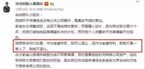 在“李国庆摔杯”“俞渝抓破脸”一来一回之后,李国庆在10月23日的微博中提及自己的诉求:“目前俞渝要求我接受25%股权就和平离婚,我拒绝同意,我要求平分。”