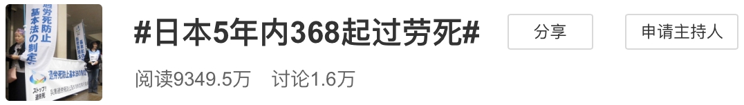此前,关于“日本5年内368起过劳死”的新闻也在微博上引发众多网友关注。