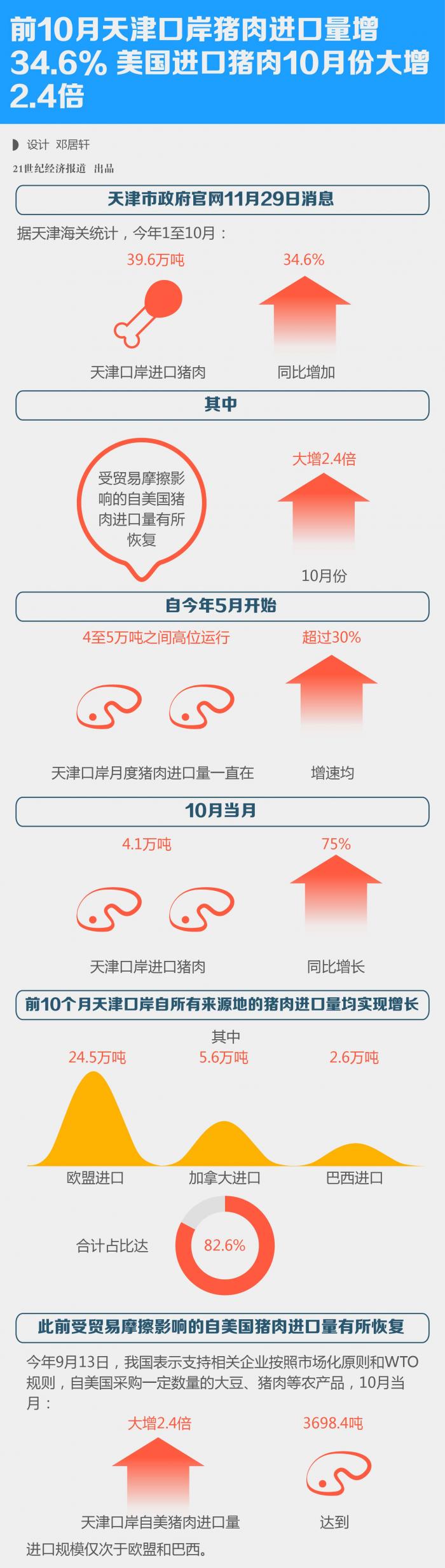 天津市政府官网11月29日消息,据天津海关统计,今年1至10月,天津口岸进口猪肉39.6万吨,同比增加34.6%。其中受贸易摩擦影响的自美国猪肉进口量有所恢复,10月份大增2.4倍。
