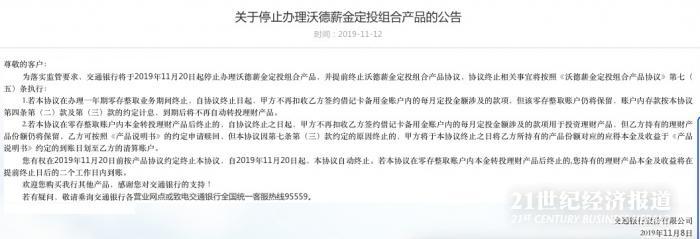 交通银行11月8日在官网公告,为落实监管要求,交通银行将于2019年11月20日起停止办理沃德薪金定投组合产品,并提前终止沃德薪金定投组合产品协议,协议终止相关事宜将按照《沃德薪金定投组合产品协议》。