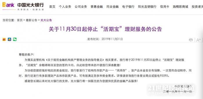 无独有偶,全国首创银行理财的光大银行也在11月1日发布《关于11月30日起停止“活期宝”理财服务的公告》。公告称,为落实监管机构《关于规范金融机构资产管理业务的指导意见》相关要求,该行将于2019年11月30日起停止“活期宝”理财服务,“活期宝”余额将转回至签约卡内。