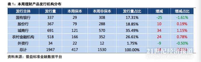 根据普益标准本周统计,保本理财发行量最高的为农村金融机构。由于此类机构数量众多,这个口径可能并不能完全说明问题,那么从本周发行的保本和非保本理财产品数量比较上来看,国有银行是1:10.6,股份行1:3.6;城商行1:4.7,农村金融机构1:2.12,依旧是以农商行为首的农村金融机构。