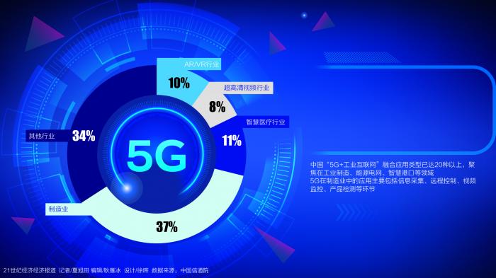中国信通院院长刘多认为,工业互联网将是5G应用的主战场,目前,中国“5G+工业互联网”融合应用类型已达20种以上,在中国5G应用项目行业分布中,AR/VR行业占10%,超高清视频行业占8%,智慧医疗行业占11%,而制造业占比则高达37%,具体应用以信息采集、远程控制、视频监控、产品检测为主。