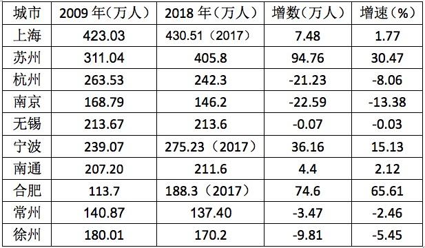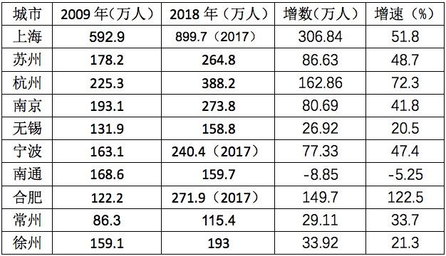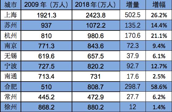 从常住人口的增量上看,上述城市可以分成四个档次:上海人口增量超过500万;合肥、杭州、苏州人口增量超过100万;南京、宁波人口增量为50万-100万之间;无锡、南通、常州、徐州人口增量不足50万。