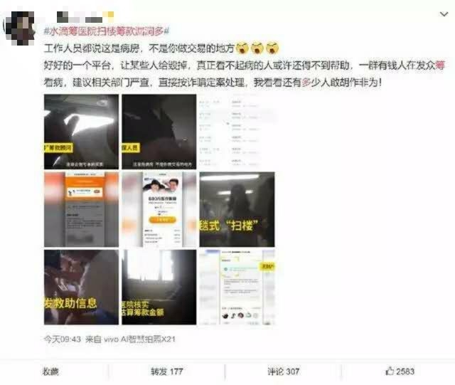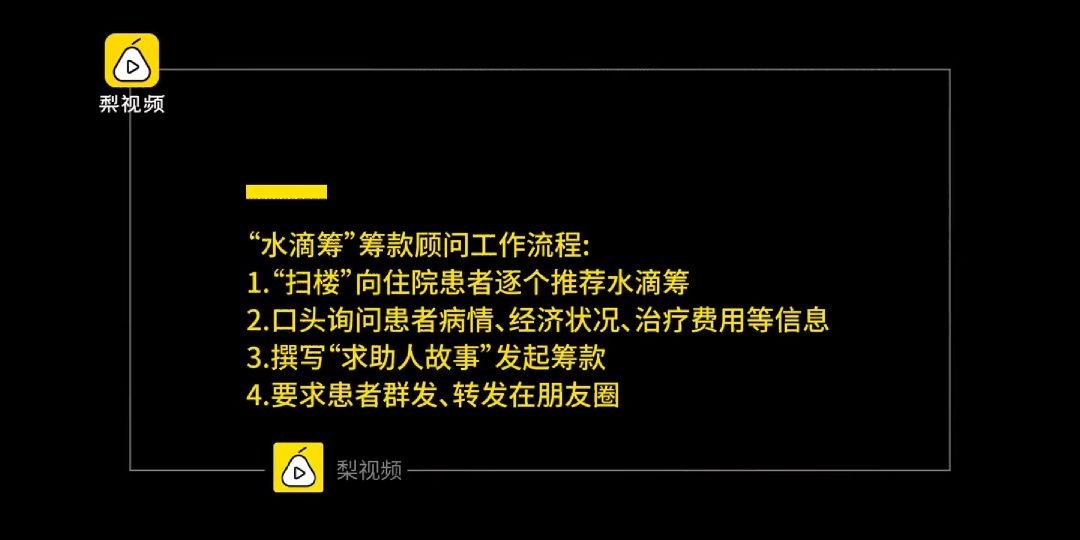 医院里“扫楼”寻找生病的“客源”,不加以审核对方的财产状况,直接模板编故事将病患发到众筹平台募捐救助金。