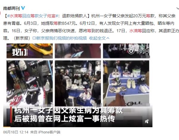 杭州一女子替父亲发起20万元筹款,称其父亲患有胃癌。6月3日,该女子提取筹款8547元。6月12日,有人发现女子在网上发有大量晒包、晒车等内容。6月16日,女子称,父亲病情恶化快速,愿意将筹到的钱退还。6月17日,水滴筹回应称,其退款正办理。