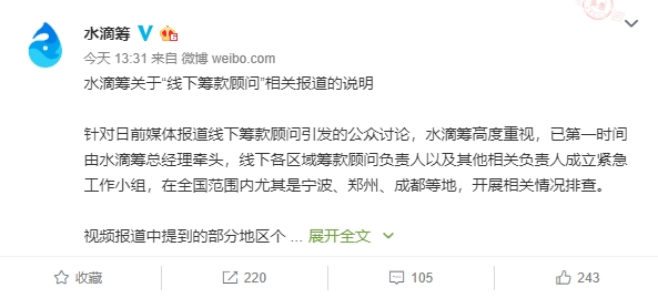水滴筹表示,视频报道中提到的部分地区个别线下人员的违规现象,严重违反了水滴公司价值观、准则及相关规定,调查清楚后将给以严惩。同时自即刻起,线下服务团队全面暂停服务,整顿彻查类似违规行为,组织重新回炉学习,再次加强平台纪律培训和提升服务规范,培训通过后方可重新提供服务。