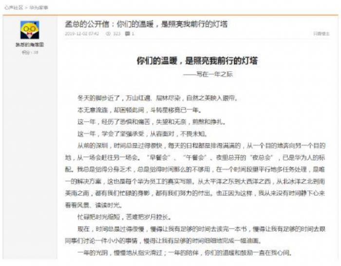 12月1日,华为CFO孟晚舟在加拿大温哥华发表了一封公开信。一年前的这一天,孟晚舟在温哥华机场被加拿大警方拘押,至今未获自由。孟晚舟在信中说,这一年,经历了恐惧和痛苦,失望和无奈,煎熬和挣扎。这一年,学会了坚强承受,从容面对,不畏未知。在信中,孟晚舟还感谢大家给她的温暖和鼓励。