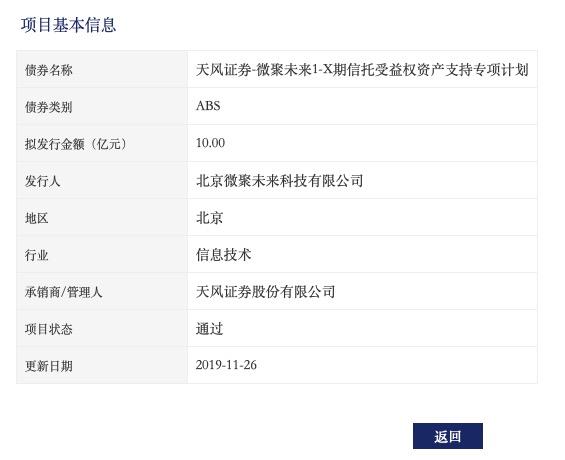 21世纪经济报道记者从深交所官网查询获悉,新浪微博借钱首单ABS已于近日获得通过,债券名称“天风证券-微聚未来1-X期信托受益权资产支持专项计划”,拟发行10亿元,发行人系微博借钱运营主体北京微聚未来科技有限公司,由天风证券作为承销商/管理人。