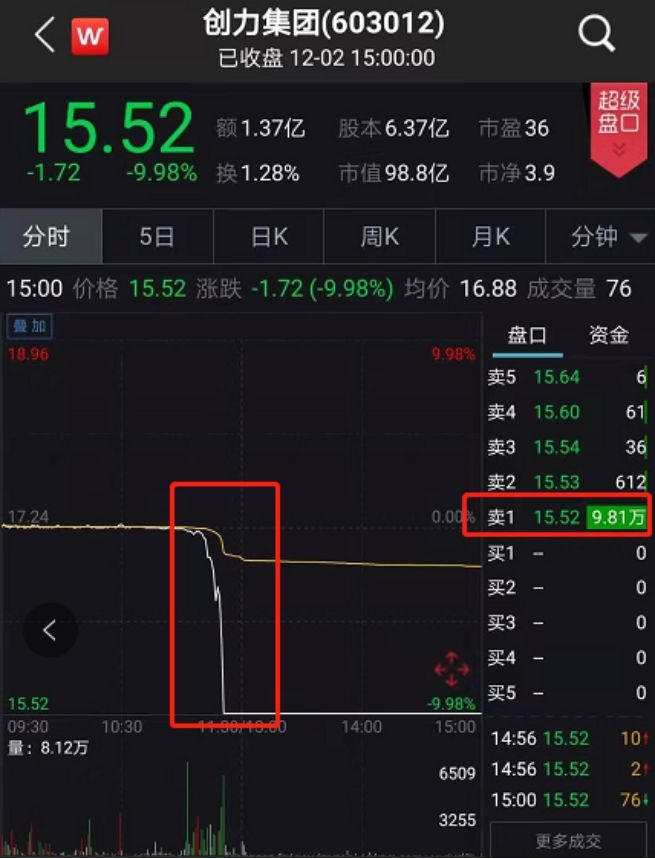 12月2日临近午盘收盘,创力集团股价突然直线跳水,股价闪崩跌停。截至当日收盘,股价报收15.52元,超9万手卖单封死在跌停板上。