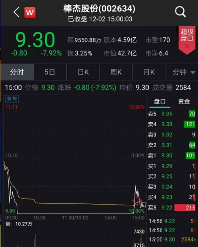 当日,棒杰股份早盘突然闪崩,超5万手卖单封在跌停板上。临近尾盘,棒杰股份终于打开跌停,但股价也同样大跌7.92%。股价报收9.30元。