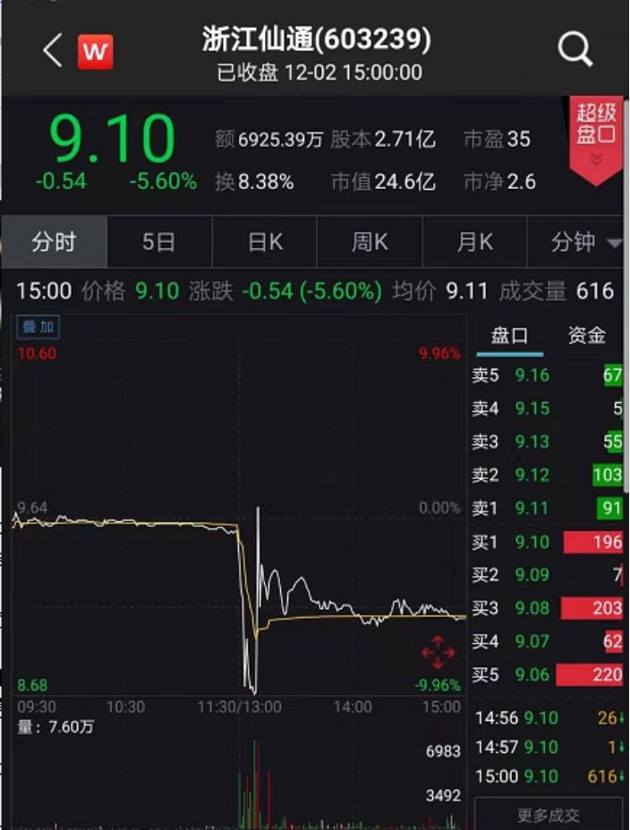 截止到当日收盘,浙江仙通股价报收9.10元,跌幅为5.6%,市值仅为24亿。